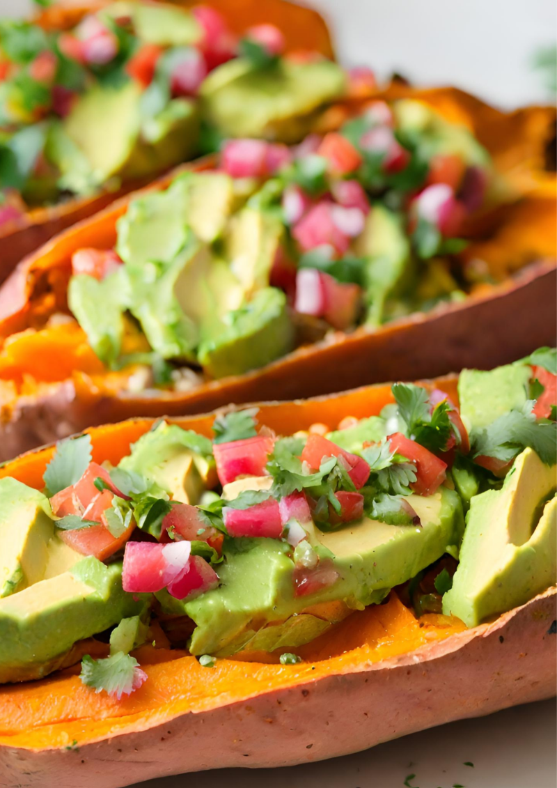 Gebackene Süßkartoffel mit Avocado-Koriander-Salsa: Eine köstliche und gesunde Mahlzeit, die den Körper mit wichtigen Vitaminen und Mineralien versorgt und gleichzeitig leicht und bekömmlich ist.
