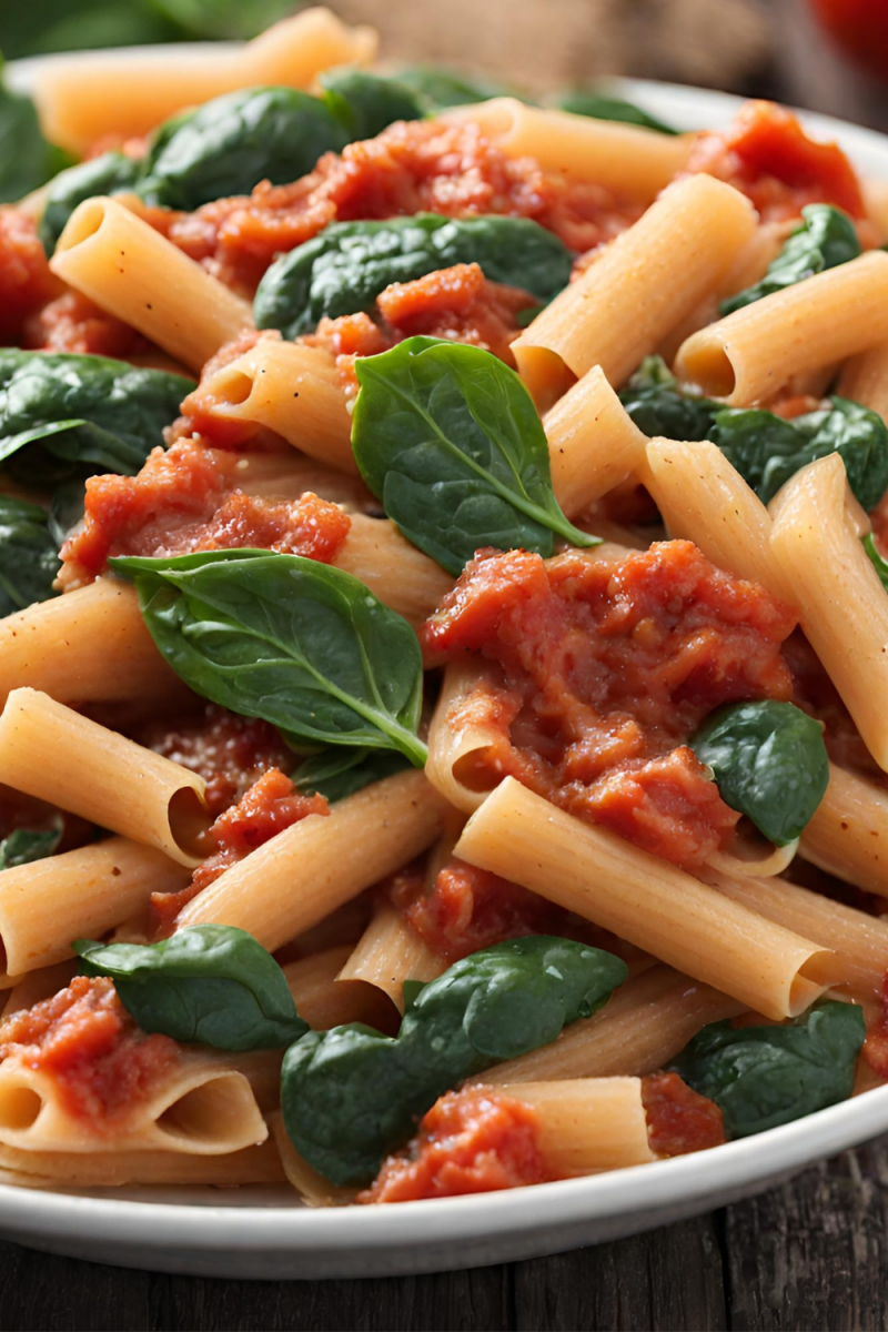 - Die gekochten Nudeln mit der Tomatensauce und Spinat servieren.