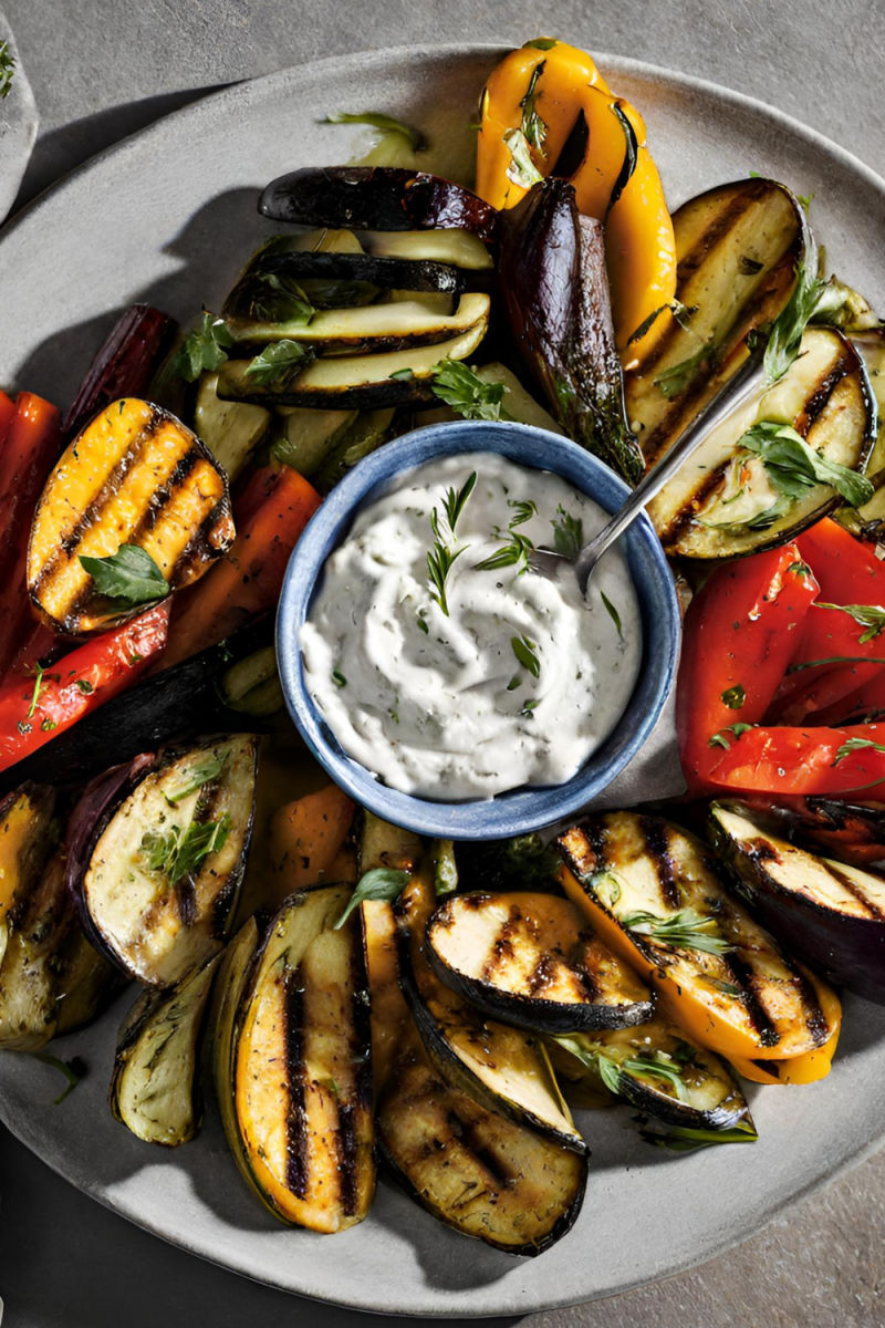 - Das gegrillte Gemüse mit dem Quarkdip servieren.