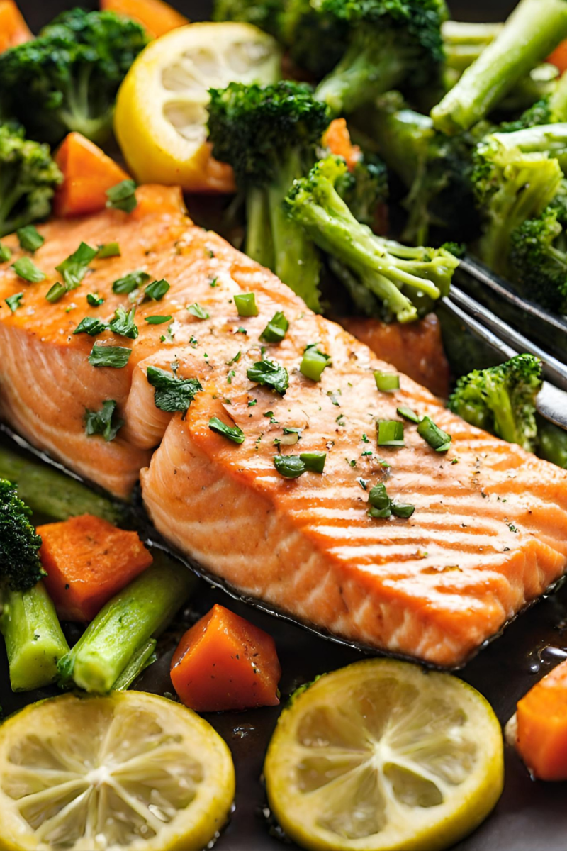 - Den gebackenen Lachs mit gedünstetem Gemüse servieren.